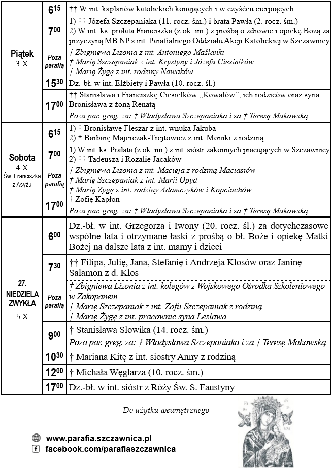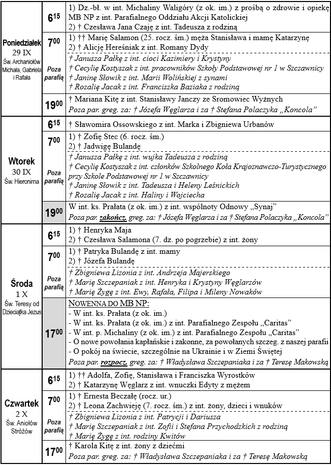 Intencje mszalne od 29.09.2025 do 5.10.2025 r.