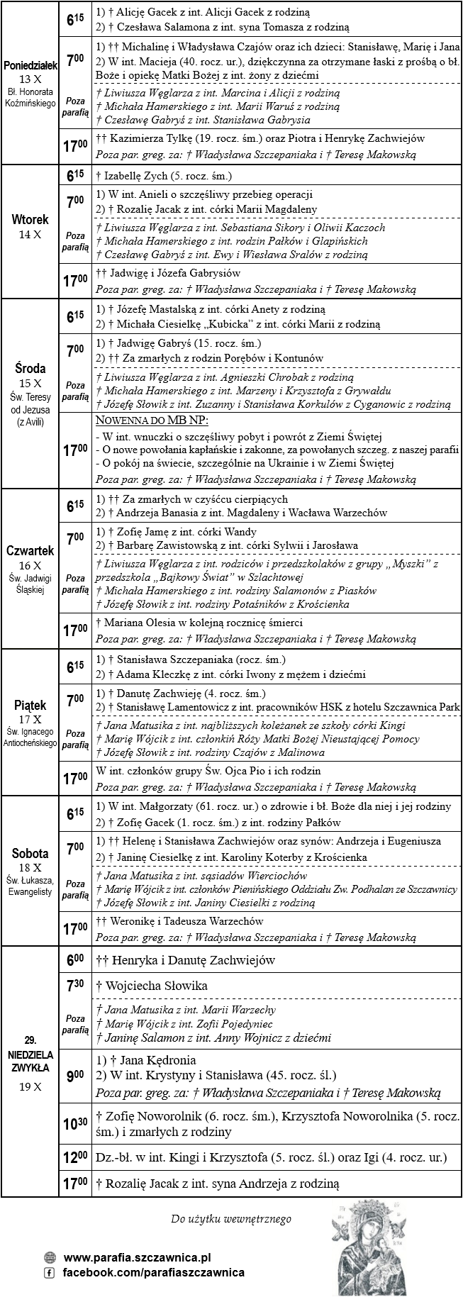 Intencje mszalne od 13.10.2025 do 19.10.2025 r.