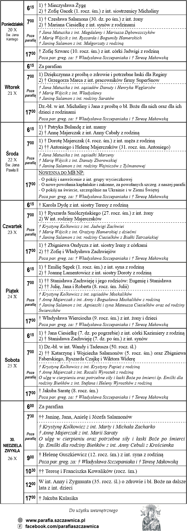 Intencje mszalne od 20.10.2025 do 26.10.2025 r.