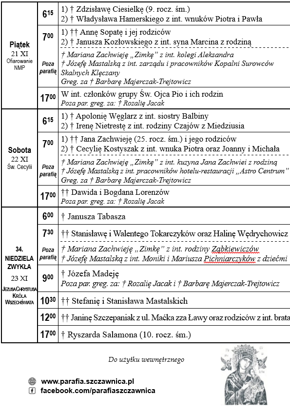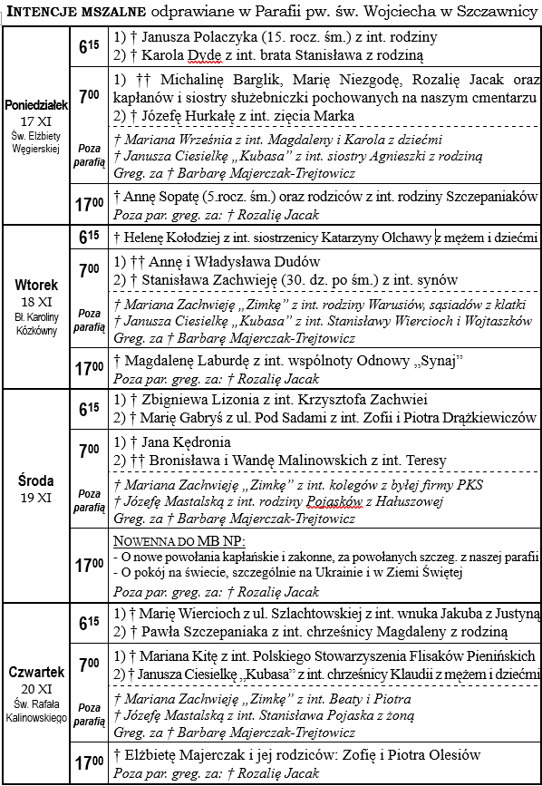 Intencje mszalne od 17.11.2025 do 23.11.2025 r.