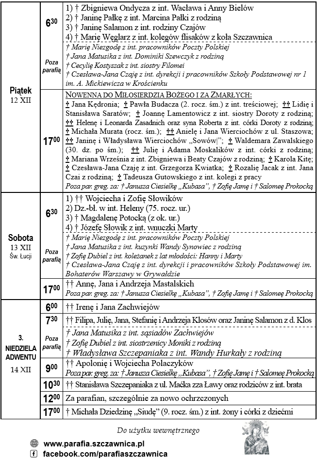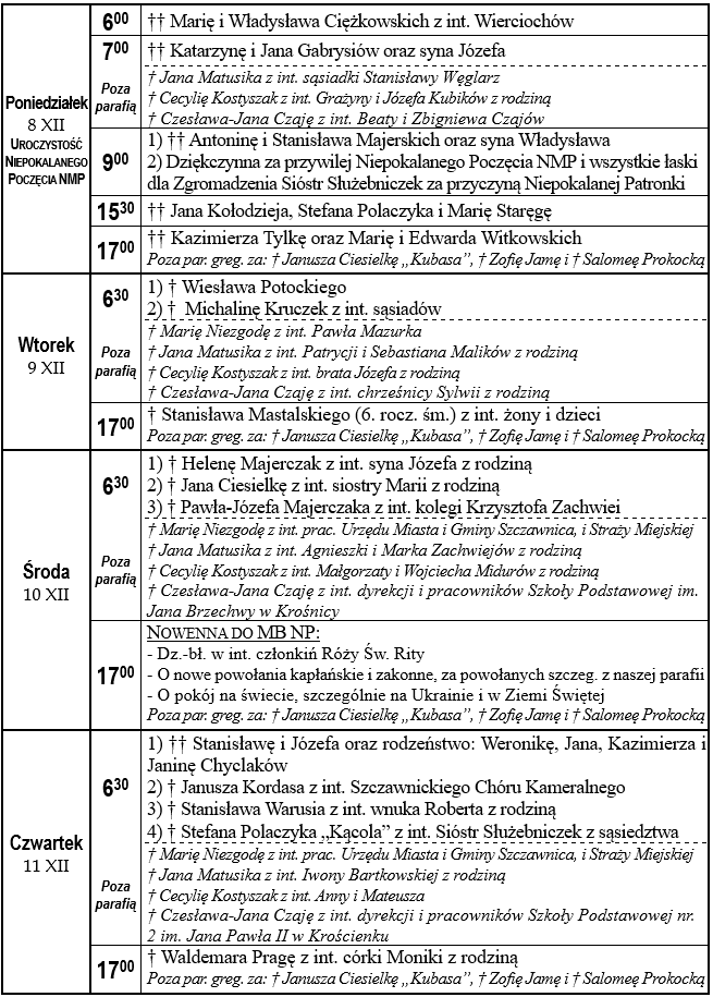 Intencje mszalne od 8.12.2025 do 14.12.2025 r.