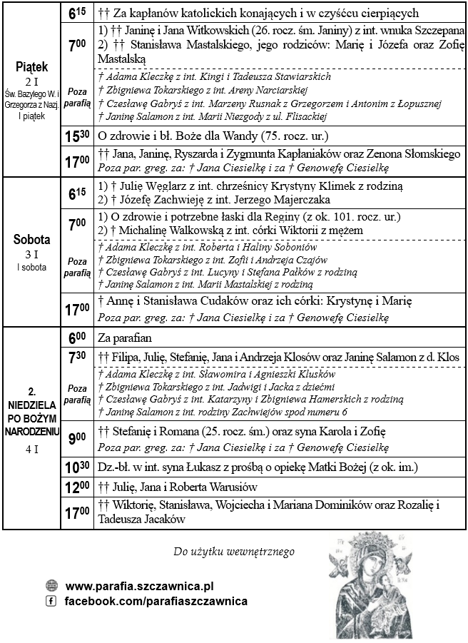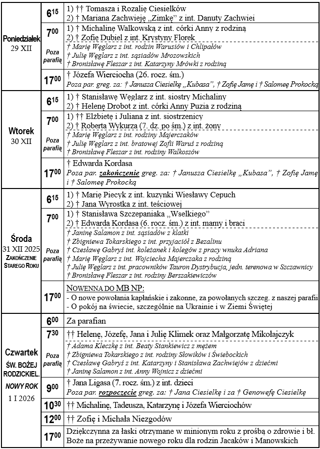 Intencje mszalne od 29.12.2025 do 4.01.2026 r.