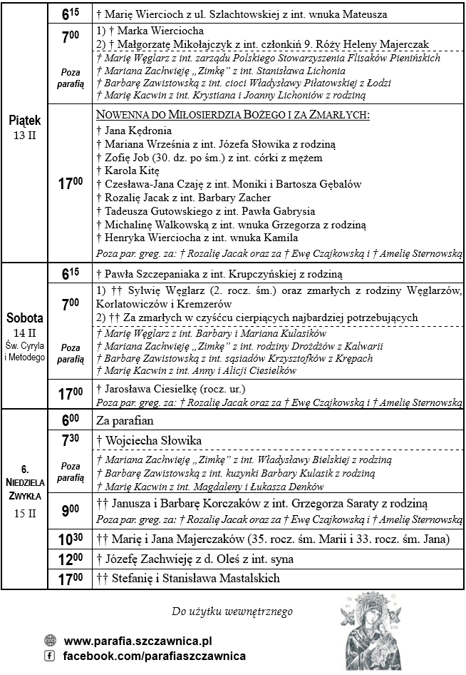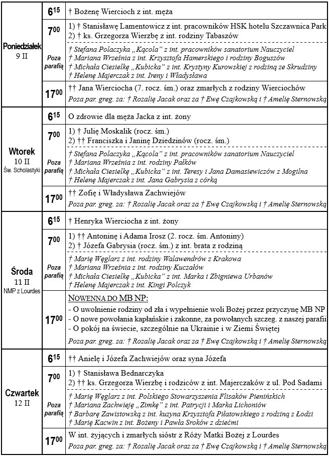 Intencje mszalne od 9.02.2026 do 15.02.2026 r.