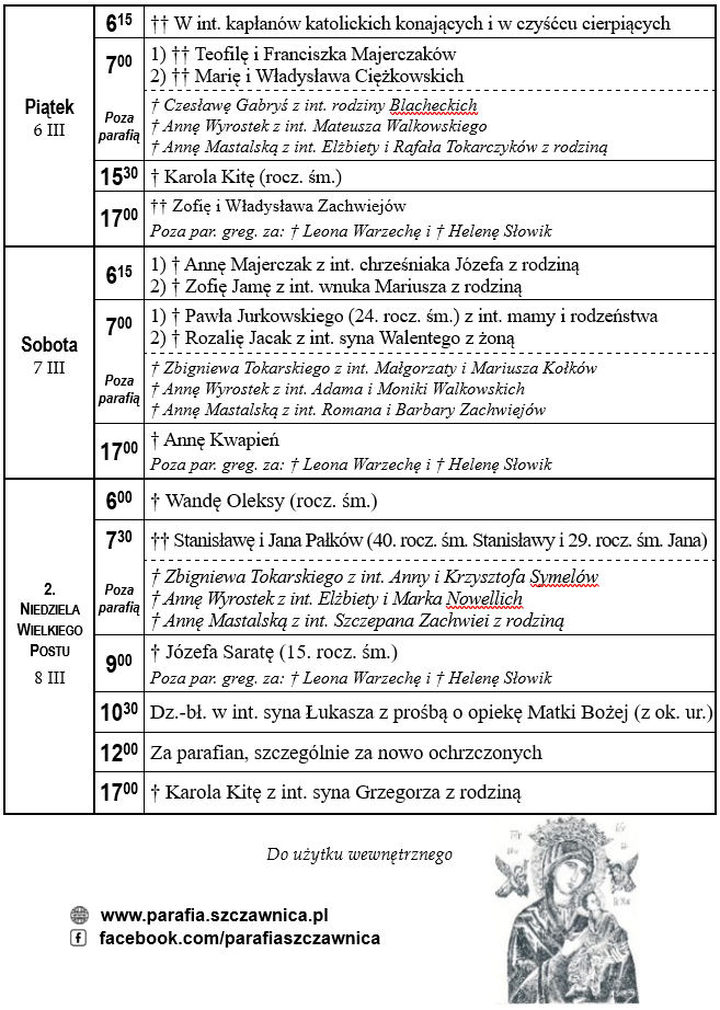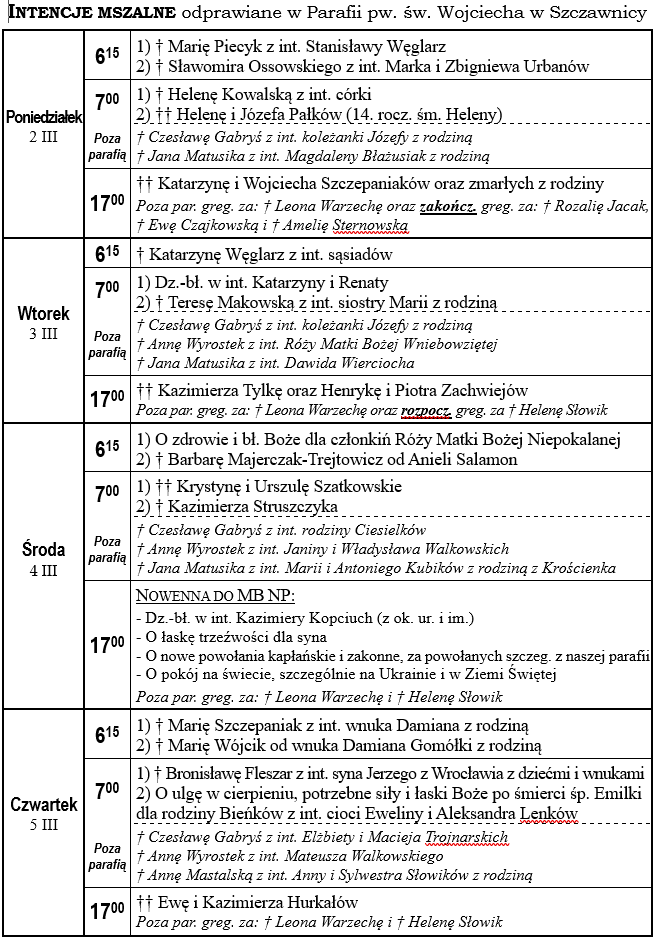 Intencje mszalne od 2.03.2026 do 8.03.2026 r.