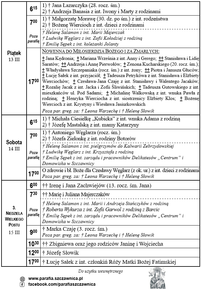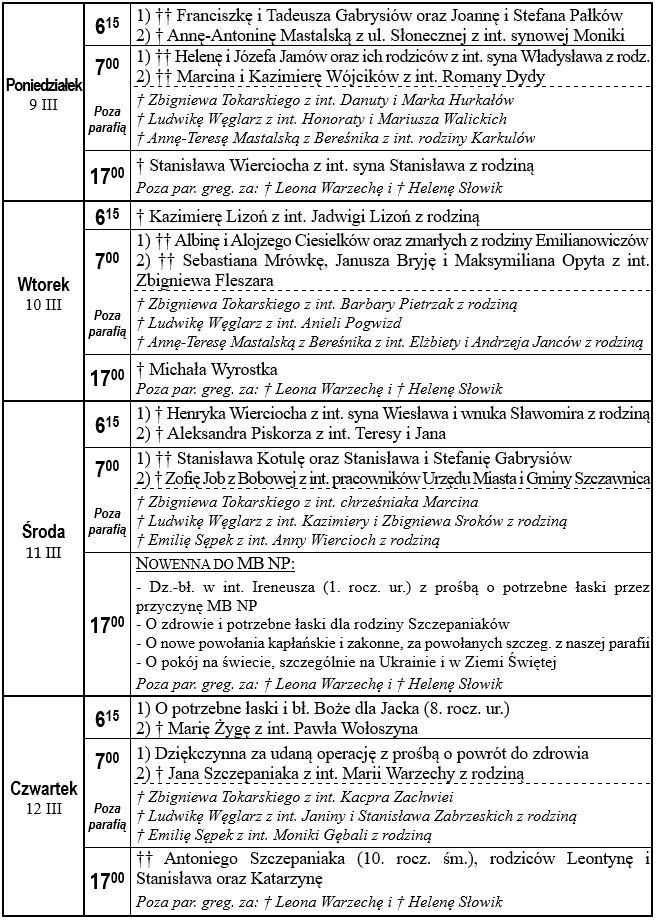 Intencje mszalne od 9.03.2026 do 15.03.2026 r.